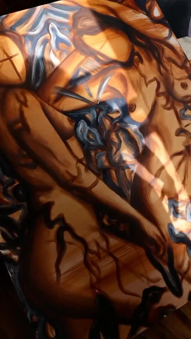 The painting is the final liberation and expression, where your body, your energy, and my own physical expression collide. I work instinctively, translating the energy of our session and the emotional undercurrents of your collage into large-scale canvases layered with oil, fragments of your body, nature, and movement. My process is physical, I paint with the same intensity I witnessed in you. The piece is painted through disruption, confrontation, flow, and resistance, until it becomes a visceral act of awareness, liberation, and presence. Each canvas is not only a representation of you, it’s an echo of your encounter with yourself, a visual documentation of the moment you faced your internal dialogue and chose, even for an instant, to fully surrender to loving yourself.